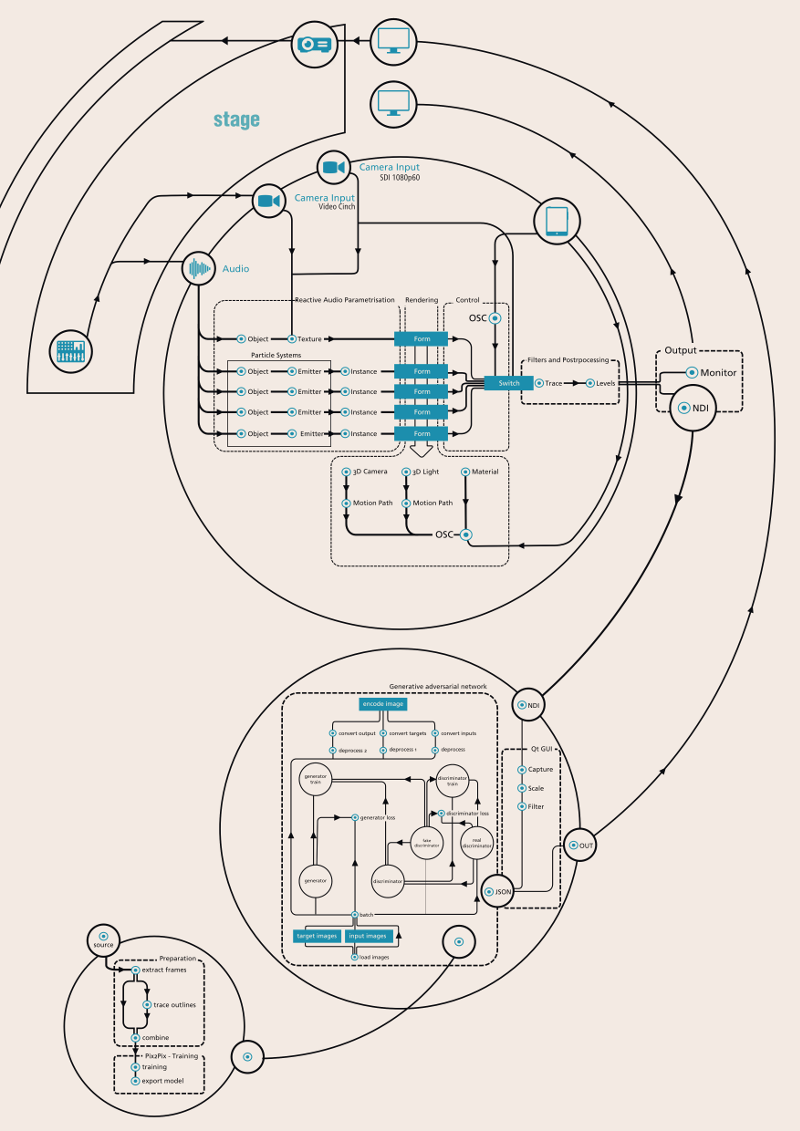 The project explores the possibilities of so-called Artificial Intelligence (AI) in conjunction with art and artistic processes. The project combines 3Dgenerated content that reacts to sound with an AI setup that transfers the structure of hand-drawn animations onto the 3D input. By combining the fast reaction times and precision of computer-generated graphics with the organic feeling of painted animations, the best qualities of two worlds are united. Within the experimental setup, the artists and creators of the original imagery are in direct exchange with the programming of the configuration and also subject to the theoretical reflection of technology and artistic practice. The AI systems are running a conditional adversarial network for reconstructing objects from edge maps.